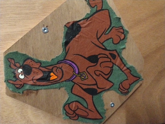 An illustration of the cartoon character Scooby-Doo is affixed to an irregularly shaped wooden panel, which is then secured to a larger, light brown wooden surface