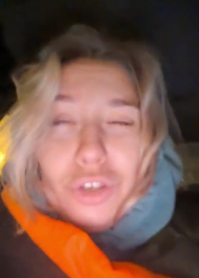 A young woman with blonde hair and fair skin is seated in a vehicle, looking at the camera. She is wearing an orange garment over a dark shirt and a green scarf. The background is dark, with glimpses of moving lights suggesting she is traveling at night. She blinks and smiles at the camera.