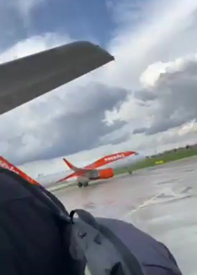 The video begins with a close-up shot of people boarding an airplane. One person has a gray backpack. The view then shifts to a scene of an EasyJet airplane on the tarmac, seen from the wing of another plane. The sky is cloudy. The EasyJet plane is in motion, seemingly taxiing. The ground is wet, possibly from rain.