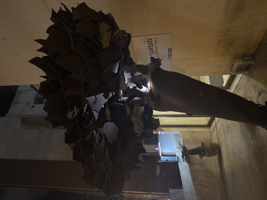 This nocturnal image displays a large, dark, patinated metal sculpture resembling a stylized tree, situated outdoors on a paved surface in Azor, Israel