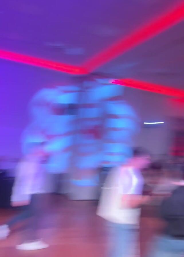 room with a crowd of people, likely at a party or event. The room has a low ceiling with red neon lights and a stage light projecting a design on the wall. The people are dressed in a variety of casual and semi-formal attire. Two young men, one wearing a white t-shirt and jeans and the other in a hoodie and jeans, are visible in the foreground of the room. People are talking and standing around, creating a social atmosphere. The video is initially blurry but gradually comes into focus.