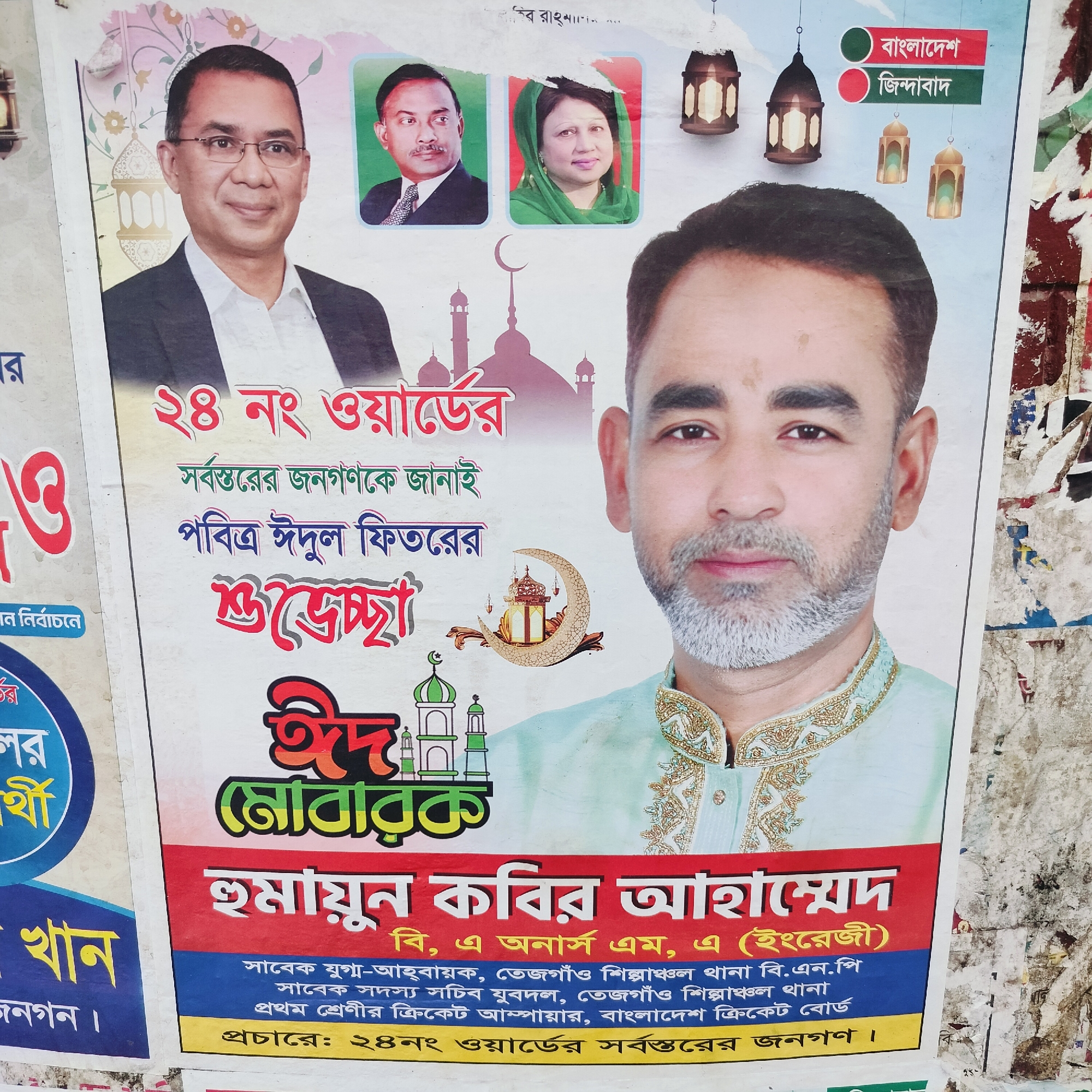 This is an image of a political poster in Dhaka, Bangladesh. The poster features portraits of three individuals at the top, with the person on the right appearing to be a woman. The text on the poster expresses greetings for Eid-ul-Fitr on behalf of the "24 no ward" and identifies the individual in the main portrait as "Humayun Kabir Ahammad," with his educational degrees listed below. His former positions are also listed, including involvement with the BNP and Bangladesh Cricket Board. The poster also includes the phrases "Bangladesh" and "Zindabad," in green and red, respectively, and "Eid Mubarak" at the center. The poster is attached to a wall in an urban environment.