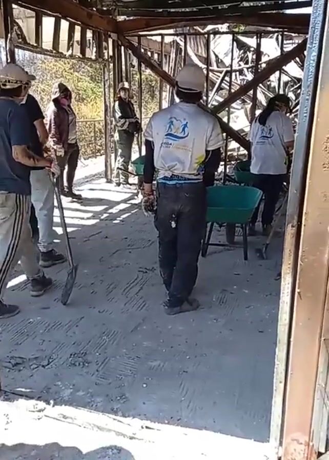 Certainly! Here's a detailed description of the video: The video shows a group of people inside a partially destroyed building. The structure appears to be made of metal framing, with significant damage to the roof and walls, possibly from a fire or other disaster. Several individuals are wearing white T-shirts with a logo, while others are in casual clothing. Some people are using shovels to clear debris, and wheelbarrows are present to transport materials. The floor is covered with rubble and ash. The video seems to be documenting a cleanup effort, possibly involving volunteers.