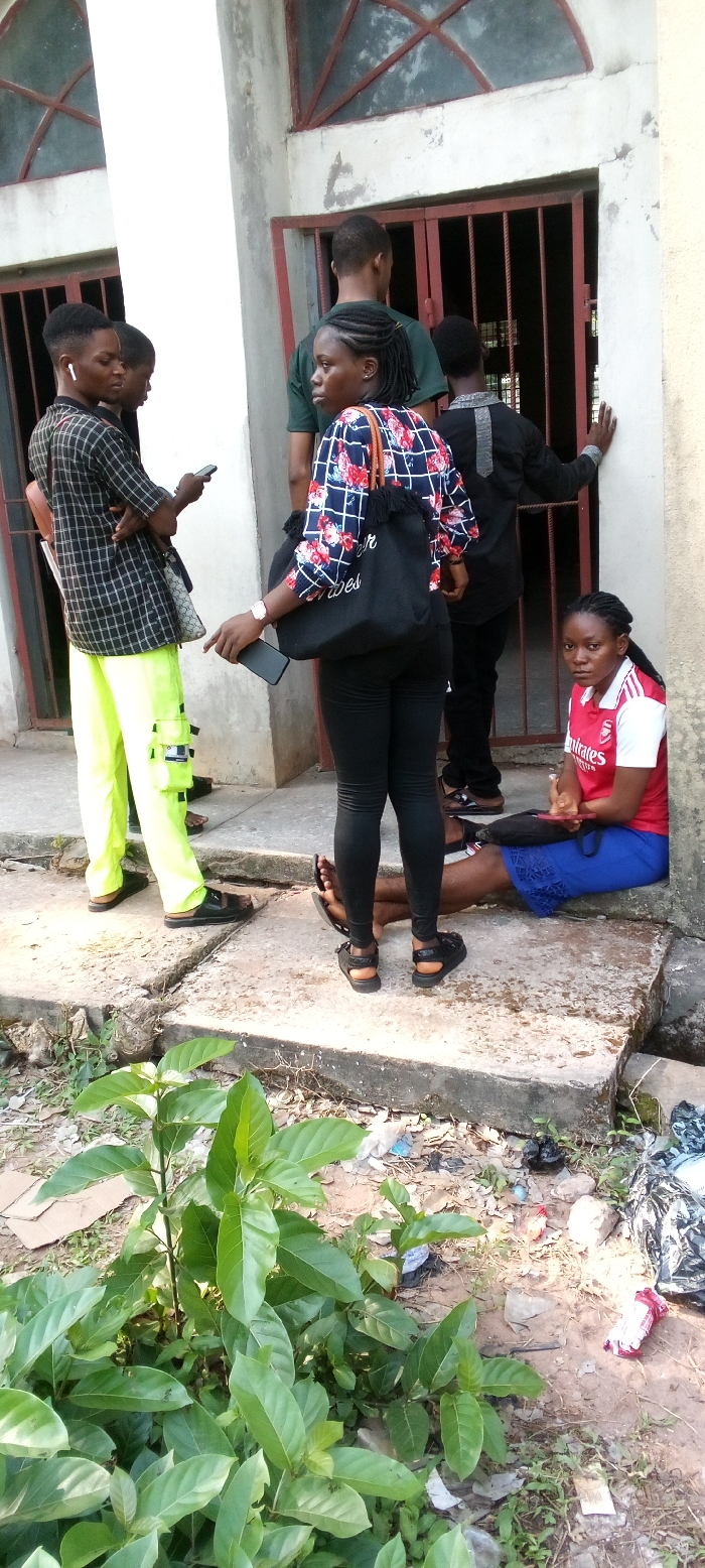 group of young adults standing and sitting in front of a building with barred windows and doors. A young woman with black hair, wearing a checkered shirt and black pants, holds a black purse with a brown strap. She stands next to a young man in a green shirt with his back turned to the camera. Another young man, wearing a black shirt and green pants, is looking at his phone and talking to a young woman with a dark shirt on. A young woman wearing a red shirt and blue pants is sitting with a black bag and holding a black object. There are some plastic bags and other debris on the ground, indicating that the location is a public place. The coordinates 5.824, 7.395 place the location in a residential area near a shopping center in Okigwe, Nigeria.