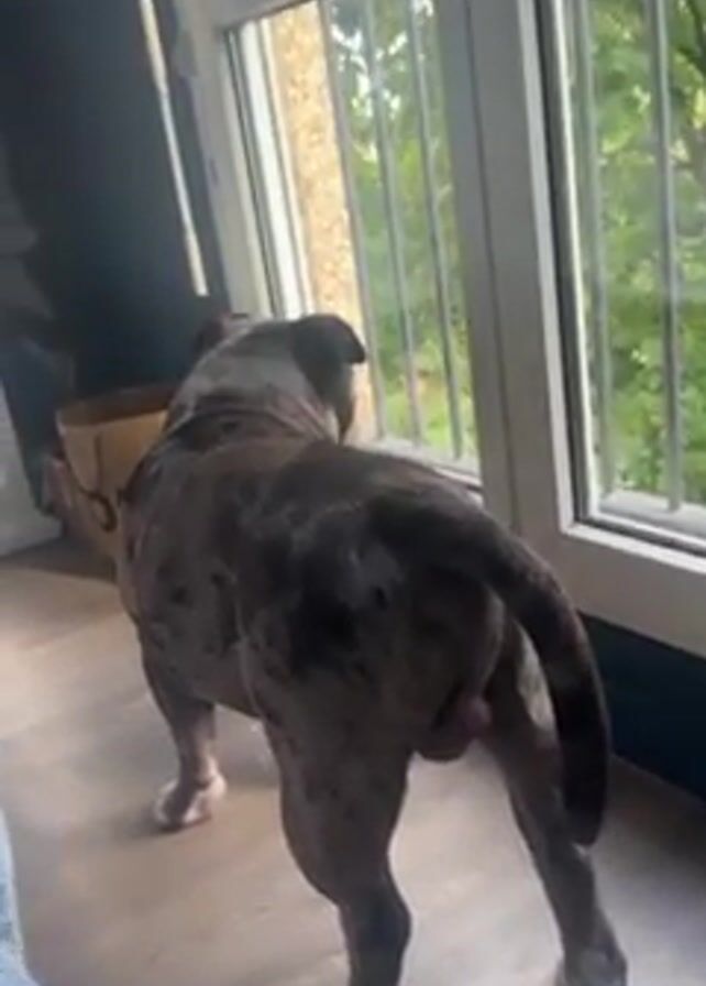person sitting in a room with a large, spotted dog. The dog, a bulldog breed, stands facing a window with bars, looking outside. The person reaches out and pats the dog on its rear. The dog then turns toward the person and nudges against their leg. The room has light wood-look flooring, a cardboard box, and what appears to be a cabinet in the background. Outside the window is green foliage. The person is wearing blue clothing and black sandals.