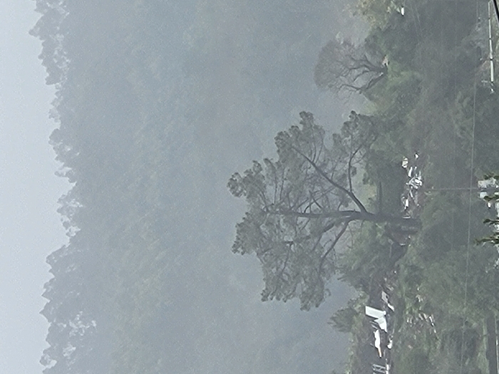 A blurry landscape features a misty hillside covered with trees. In the foreground, a large tree with prominent branches stands out, partially obscuring a row of white buildings below. Power lines intersect the scene. The weather appears overcast and foggy, contributing to the muted colors and limited visibility.