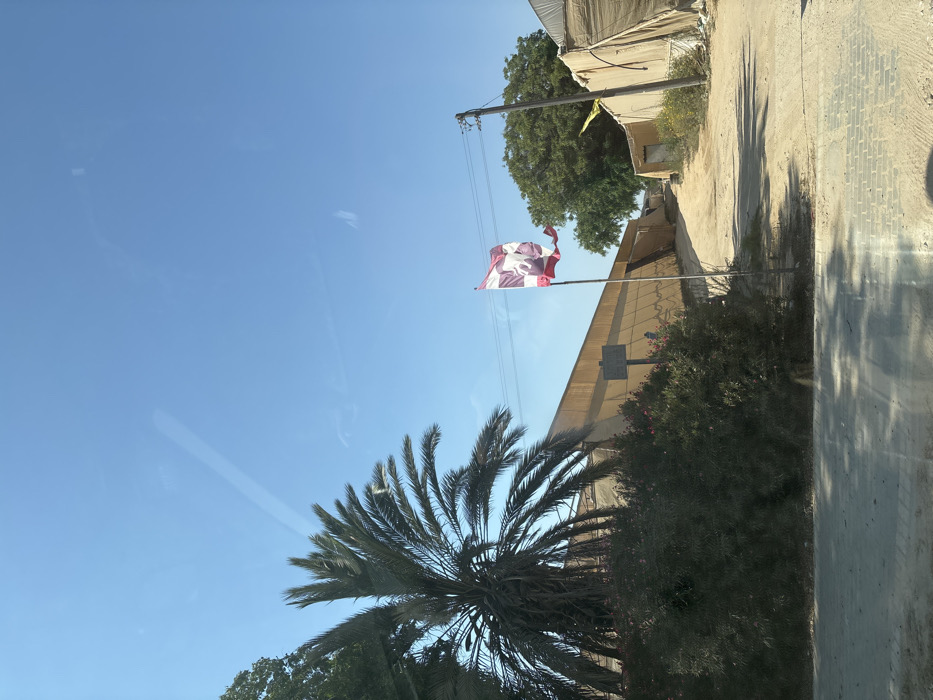 The image depicts an agricultural area within the Eshkol Regional Council, Israel, under a clear blue sky. In the foreground, a light-colored ground surface, appearing to be a dirt path with some paved sections, extends towards the viewer. To the left, dense green shrubbery with scattered small red blossoms is present, behind which a dark, rectangular sign or plaque is visible at ground level. A large palm tree with dark green fronds rises prominently on the left side of the frame. The midground features a unpaved dirt road leading into the distance, flanked on both sides by large, light-tan, fabric-covered structures, consistent with agricultural greenhouses or shade houses. On the right side of the path, a tall metal pole supports a flag, predominantly red and white with a central emblem appearing to be a lion, indicating the flag of the Eshkol Regional Council. Adjacent to the flag pole is a wooden utility pole with overhead power lines. Further down the dirt path in the background, additional similar agricultural structures and scattered green trees are visible. No individuals are present in the scene. The overall environment appears sunny and arid.
