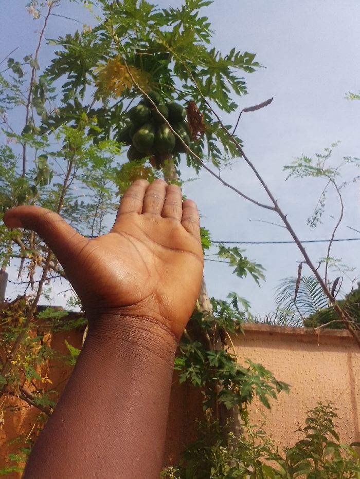 A low-angle photograph captured in the city of Unknown, Unknown, depicts a dark-skinned human left forearm and open hand in the foreground, reaching upwards with the palm facing towards the sky and fingers slightly splayed. The hand is positioned directly beneath a papaya tree (Carica papaya) which dominates the upper-left and central portion of the frame. This papaya tree bears multiple clusters of green, unripe papayas densely packed along its trunk, surrounded by large, palmate green leaves, some showing signs of yellowing. Additional green foliage, including slender branches with small leaves consistent with a Moringa tree (Moringa oleifera) and faint outlines of palm fronds, is visible in the midground and background. The upper portion of the image is dominated by a clear, bright blue sky with minimal cloud cover, indicating sunny outdoor conditions. In the lower-right background, a textured, light-colored (tan/orange) rendered wall, topped with a security wire, is partially visible.