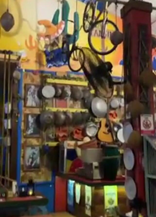 interior of a restaurant decorated with an eclectic mix of items. The camera pans slowly around the room, showcasing the decorations on the walls and ceiling. There are various objects hanging from the ceiling, including bicycles, fans, and flags. The walls are covered with pots, pans, pictures, and other miscellaneous items. There are wooden tables and benches arranged throughout the restaurant. A television is mounted on a shelf in the background. The lighting is somewhat dim, and the overall atmosphere is casual and unique. There are no people visible in the video.