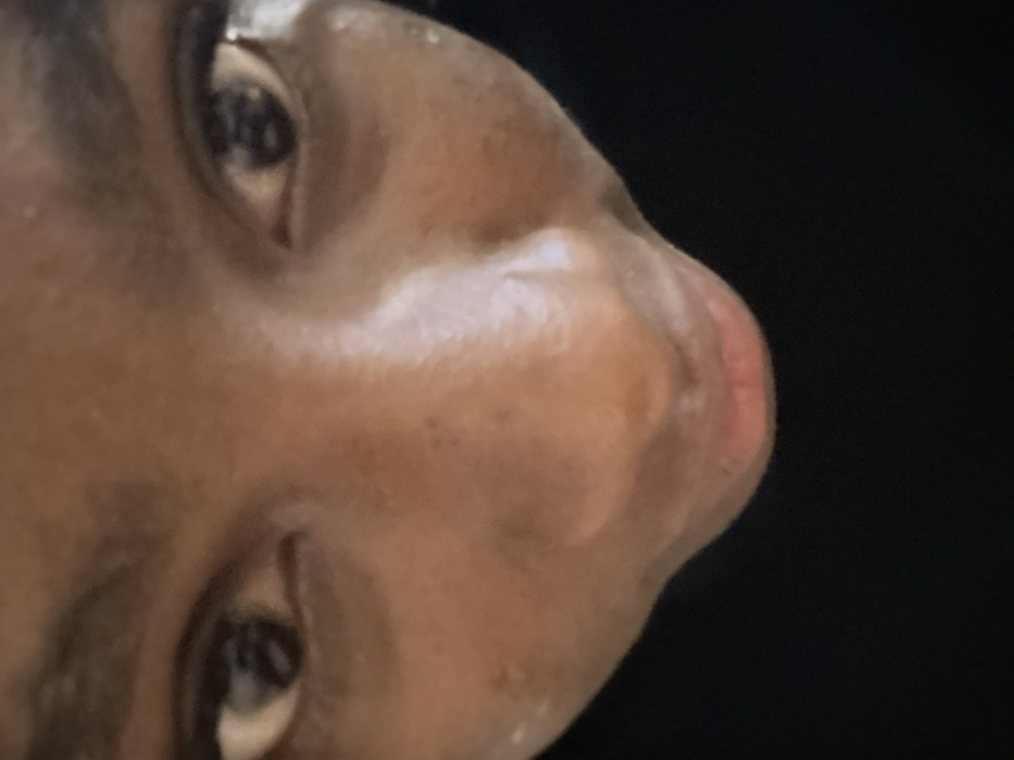 A close-up, angled perspective shows a person's face. Eyes, nose, and lips are prominent. The skin tone is brown, and there are visible pores and some minor blemishes. The background is dark, providing contrast to the skin. The image has an intimate feel, due to the extreme proximity.