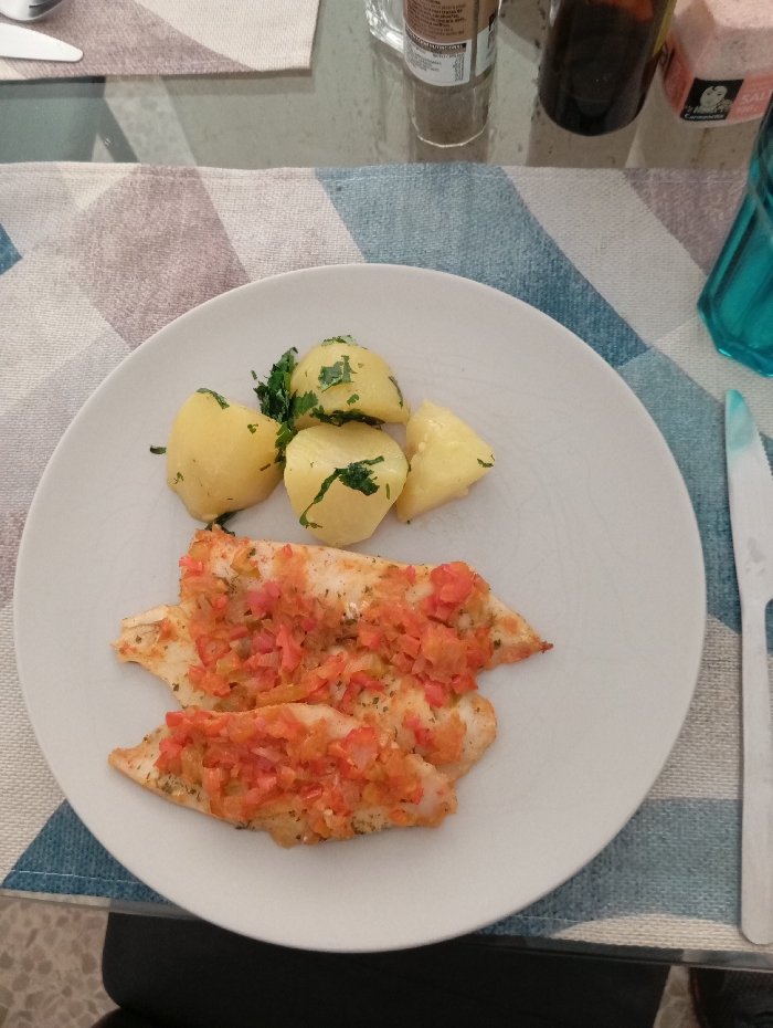 The image displays a meal served on a white, round plate, situated on a glass table within an indoor setting in Ripollet, Spain. The plate contains two pieces of white fish fillet, topped with a coarse salsa of finely diced red tomatoes and other small, light-colored ingredients, with sparse green herb specks visible beneath. Alongside the fish are several pieces of boiled or steamed potatoes, each garnished with chopped green herbs, consistent with parsley. The plate rests on a placemat patterned with geometric squares and rectangles in light blue, white, and light brown/grey tones. To the right of the plate, a silver-colored knife with a light blue handle or accent is partially visible on the placemat. A ribbed, translucent blue drinking glass is positioned on the table behind the knife. In the upper background, on the glass table, a clear glass container with a label, a dark-colored bottle, and a container of pink salt are visible. A partial view of a dark, possibly black, object is present at the bottom edge of the frame.