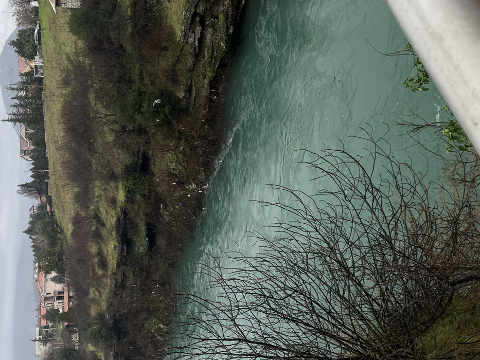The image depicts a section of a river in Podgorica, Montenegro, under an overcast sky
