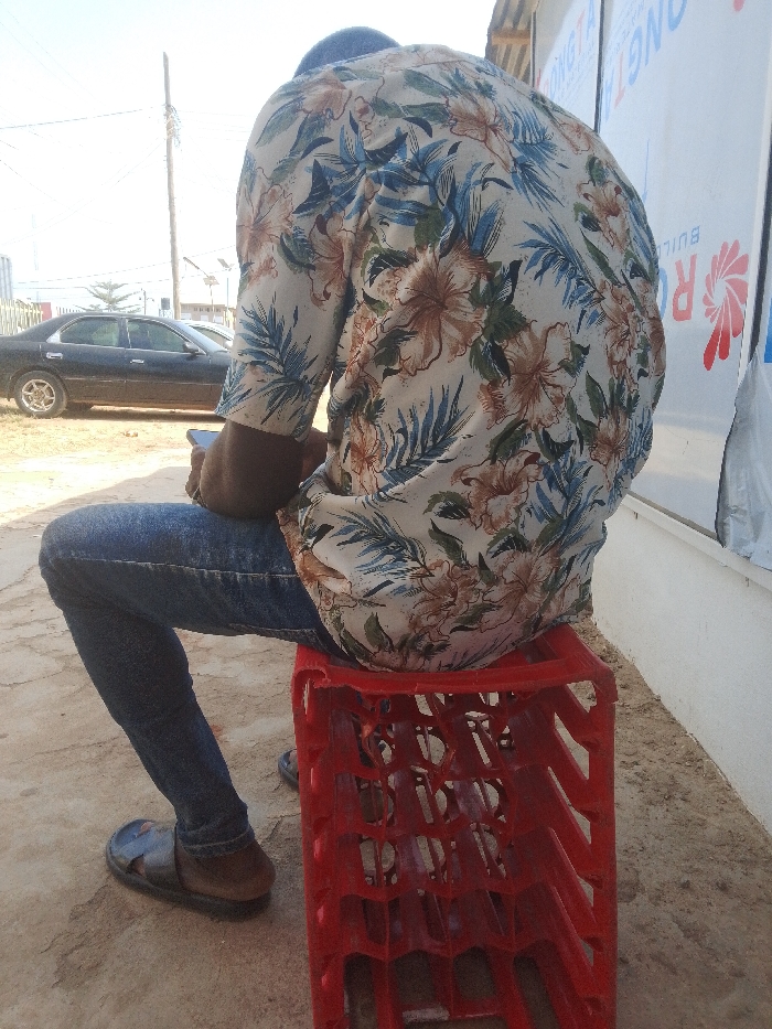 An individual, observed from the back, is seated on an inverted red plastic bottle crate in Abeere, Nigeria