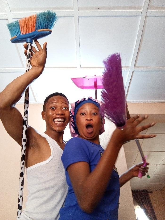 This image depicts two individuals, a male and a female, posing indoors within what appears to be a residential or utility space in the city of Unknown, Unknown. The male, positioned on the left, wears a white sleeveless undershirt. He has short dark hair and a wide, open-mouthed smile, with eyes wide open. His right arm is extended upward, holding a broom with a blue and orange bristle head and a black-and-white patterned handle. The female, positioned on the right, wears a blue short-sleeved top and a blue headwrap with pinkish-silver accents. She exhibits a wide-mouthed expression of surprise or shock, with eyes similarly wide. Her arms are bent, holding a purple duster or small broom with a pink handle. In the background, a pink plastic dustpan or similar cleaning item is suspended from the white ceiling, which features visible structural panels. The walls are light-colored, and a window with dark curtains is partially visible in the far-right background. Both individuals are actively engaged in exaggerated poses, holding cleaning implements.