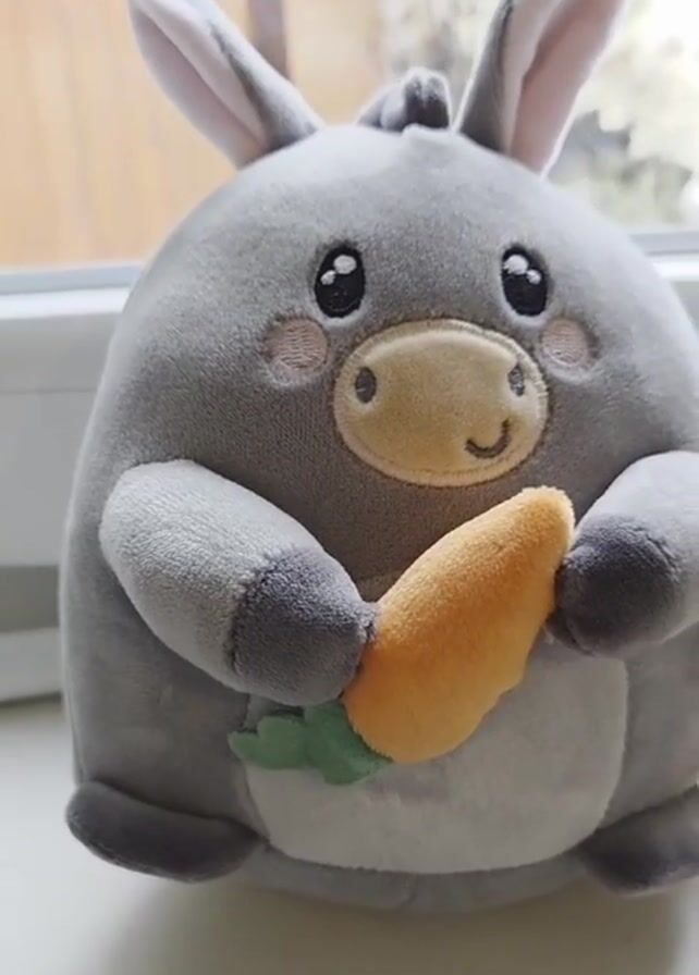 A gray stuffed donkey toy sits on a white surface. The donkey has large eyes, rosy cheeks, a tan snout, and a small smile. It holds an orange plush carrot with green leaves in its paws. A red tag with "LEGAMI" printed in white is attached to the donkey's side. A small card with an illustration of the same donkey is visible next to the toy. Faintly in the background, a blurry window pane is seen. Music with male vocals plays in the background.