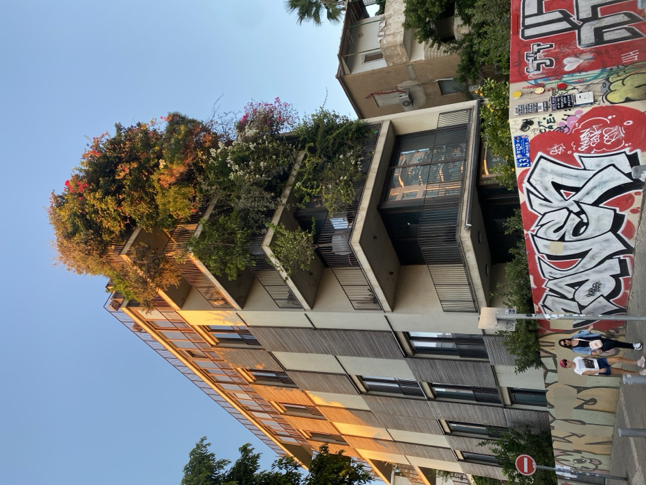 - "An exterior long shot captures a modern, six-story residential building with extensive vertical gardens on its balconies and rooftop, contrasting with an older, smaller building to its right, under a clear blue sky in Tel Aviv, Israel" by FM-LMNxv1, licensed under CC BY 4.0