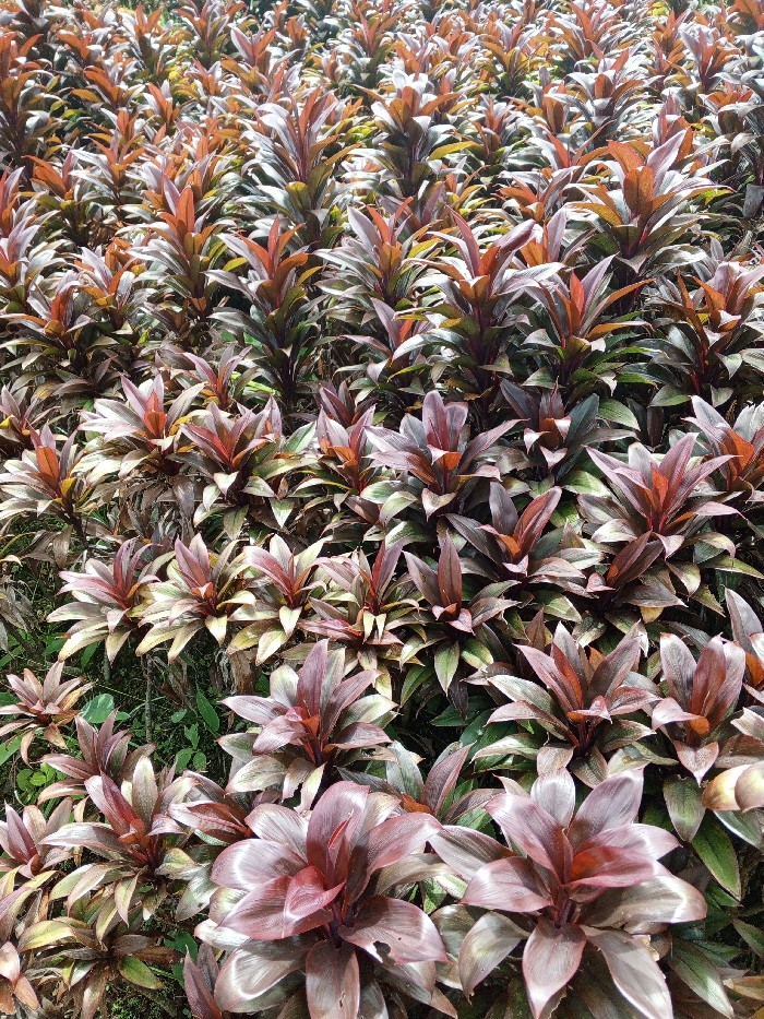 This image presents a dense, uniform field of cultivated plants, located in Gbelleah, Liberia. The primary subjects are numerous herbaceous plants, likely a variety of Cordyline fruticosa or similar Dracaena species, characterized by broad, elongated leaves. The foliage exhibits a range of colors, predominantly deep reddish-brown and burgundy hues, transitioning to bronze, pinkish-red, and green, particularly towards the bases and older leaves. The plants are arranged in tightly packed rows or a dense matrix, extending from the foreground to the background, creating a textured pattern across the entire frame. Each plant grows upright, with leaves radiating from a central point. There are no individuals, animals, or artificial structures visible within the scene. The underlying ground surface is largely obscured by the dense plant growth, with only minor dark green patches visible between individual plants.