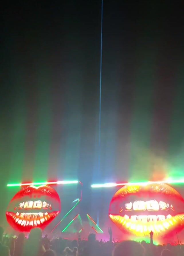 The video depicts a nighttime outdoor concert scene, showcasing a large crowd facing a stage with elaborate lighting and visual displays. Two oversized screens shaped like mouths with prominent teeth flank the stage. These screens emit bright, pulsating light, frequently changing color from yellow to red and white. Green and red laser beams crisscross above the stage and project upwards. The crowd appears to be engaged and enthusiastic, with many people raising their hands in the air. The overall atmosphere is energetic and festive. As the video progresses, the screens shift to displaying animated figures playing instruments.