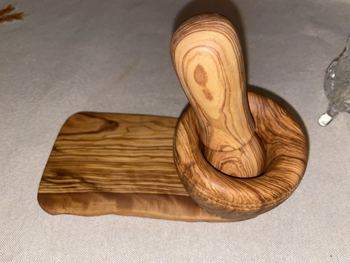 This image, located in the city of Danilovgrad, Montenegro, depicts a set of culinary tools arranged on a light-colored, textured fabric surface. The central objects are an olive wood mortar and pestle, positioned on the right portion of a rectangular olive wood serving board. The pestle is partially inserted into the mortar. Both the mortar, pestle, and board exhibit characteristic olive wood grain with varying shades of light and dark brown. The serving board features a slightly irregular, natural edge along its lower side. In the upper right background, a fragmented clear, faceted object, consistent with cut glass or crystal, is partially visible. The fabric surface beneath the objects displays faint, irregular darker discolorations. No human subjects, actions, or interactions are present in the scene.