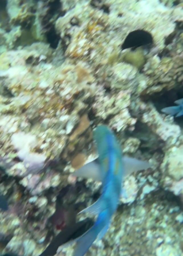 The video depicts an underwater scene featuring a coral reef. Several fish are visible, including a blue and yellow fish with stripes, as well as some dark-colored fish. The fish swim around the coral formations, which appear to be various shades of brown, white, and green. The water is clear enough to observe the scene relatively well, though there is some slight blurriness and chromatic abberation.