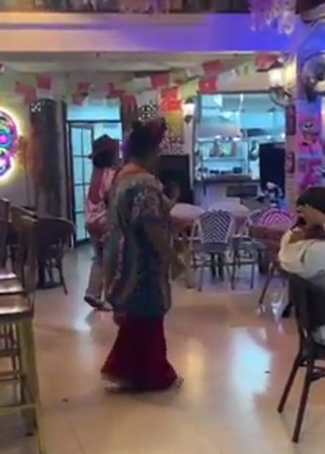 A medium shot shows three costumed women dancing in a restaurant. The woman in the foreground wears a patterned tunic and loose red pants. The second woman wears a white shirt, black pants, and a backpack. All three wear wigs of various colors. The restaurant is decorated with festive lights, colorful banners, and a large, glowing, Day-of-the-Dead skull decoration. There are empty tables and chairs scattered throughout the space. A kitchen area is visible in the background.