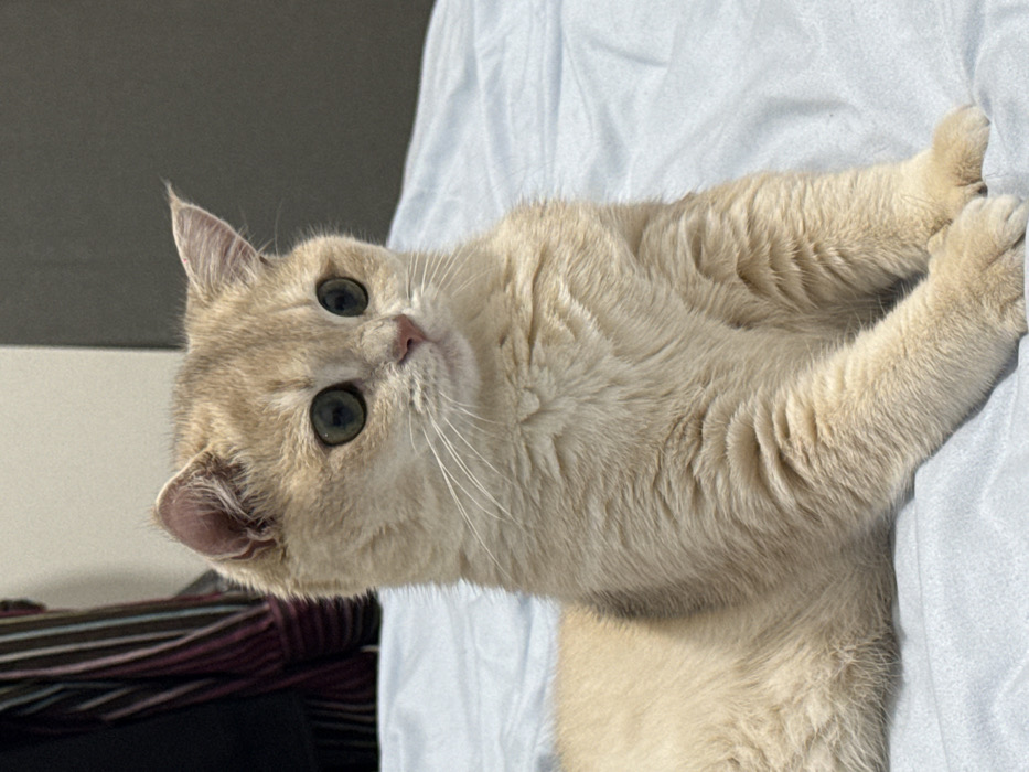 - "The image displays a light cream-colored cat with prominent green-gold eyes and a pink nose, positioned on a light blue, wrinkled bedsheet" by FM-UFsim1, licensed under CC BY 4.0