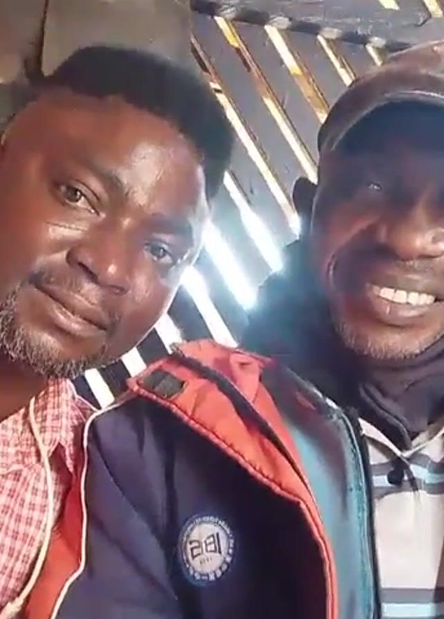 Two middle-aged men are in a selfie shot, sitting close together. The man on the left has dark hair with a distinct cut and a well-groomed beard. He wears a red and white checkered shirt and is smiling. The man on the right is wearing a baseball cap and a jacket with red and blue accents. He is also smiling. Behind them is a structure made of wooden slats, allowing a bright, diffused light to come through. The environment suggests they may be outdoors or in a semi-enclosed space.