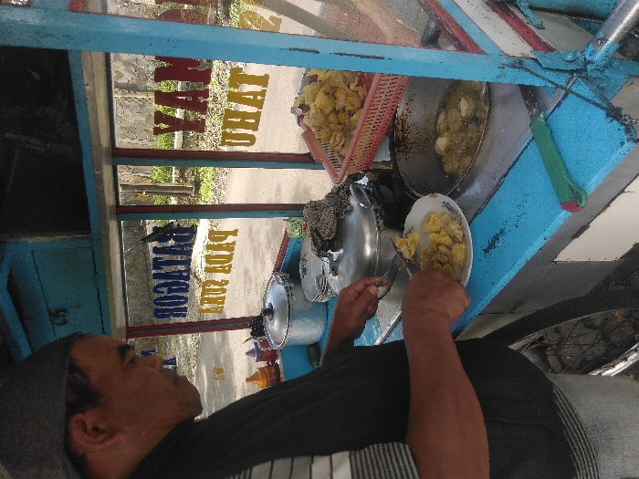 The image displays a street food vendor preparing food from a mobile cart in Cipanas, Indonesia