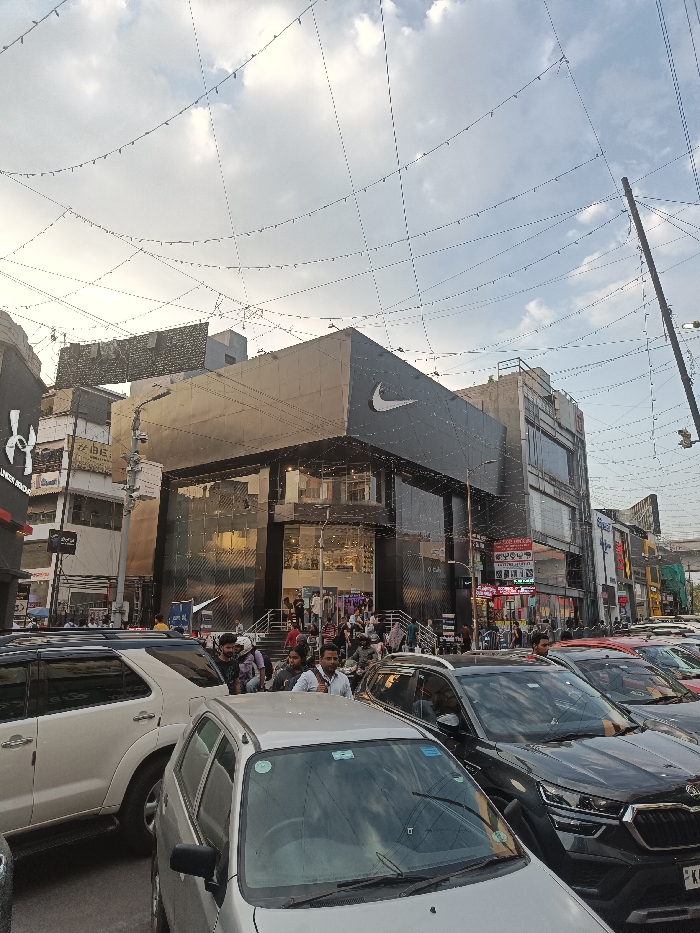 The image captures a street scene in Bengaluru, India, at the location of latitude: 12.974, longitude: 77.608. The scene shows a busy street with a Nike store on the right side. A large crowd of people can be seen entering and exiting the store. Several cars are parked along the street, with some people standing around them. The sky is cloudy and there are strings of lights strung up across the street. The overall environment is bustling and lively.