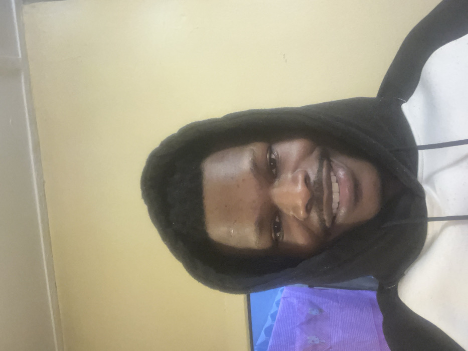 A man smiles at the camera, wearing a black hoodie with a white top underneath. The hood is up, framing his face. The background consists of a yellow wall, a white door frame on the left, and a blue surface with lavender fabric beneath the man. The image is rotated slightly to the right.