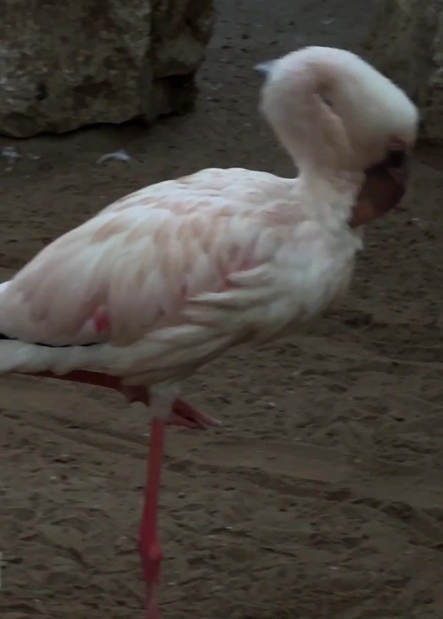 flamingo standing on one leg in a sandy enclosure, with rocks in the background. The flamingo is white with hints of pink in its feathers, and its legs are bright pink. It turns its head and bends its neck, seemingly grooming itself. There are a few stray feathers on the ground.