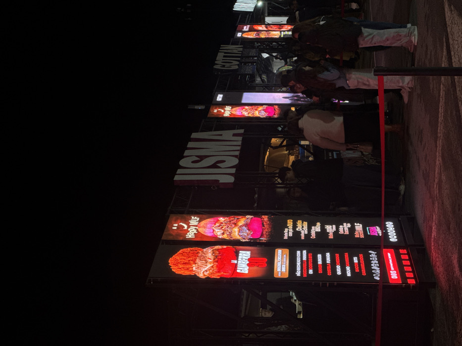 A vertically-oriented image shows a nighttime scene of a food stand. Signs illuminated with bright lights advertise the restaurant's name as "JISMA". The stand promotes "LA GAMBERRA" and "Happy MILF" burgers. A menu board lists ingredients like mozzarella, smash burger, smoked ribs, cheddar cheese, "Gamerra" sauce, and caramelized bacon bits. People are lined up, waiting to be served. The upper signage visible mentions "GOTTAN" above them.