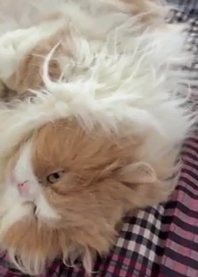 A fluffy, long-haired cat with white and light orange fur is lying on its back on a red and black plaid surface. The cat's paws are curled up, and it appears to be breathing heavily. Its eyes are partially closed.