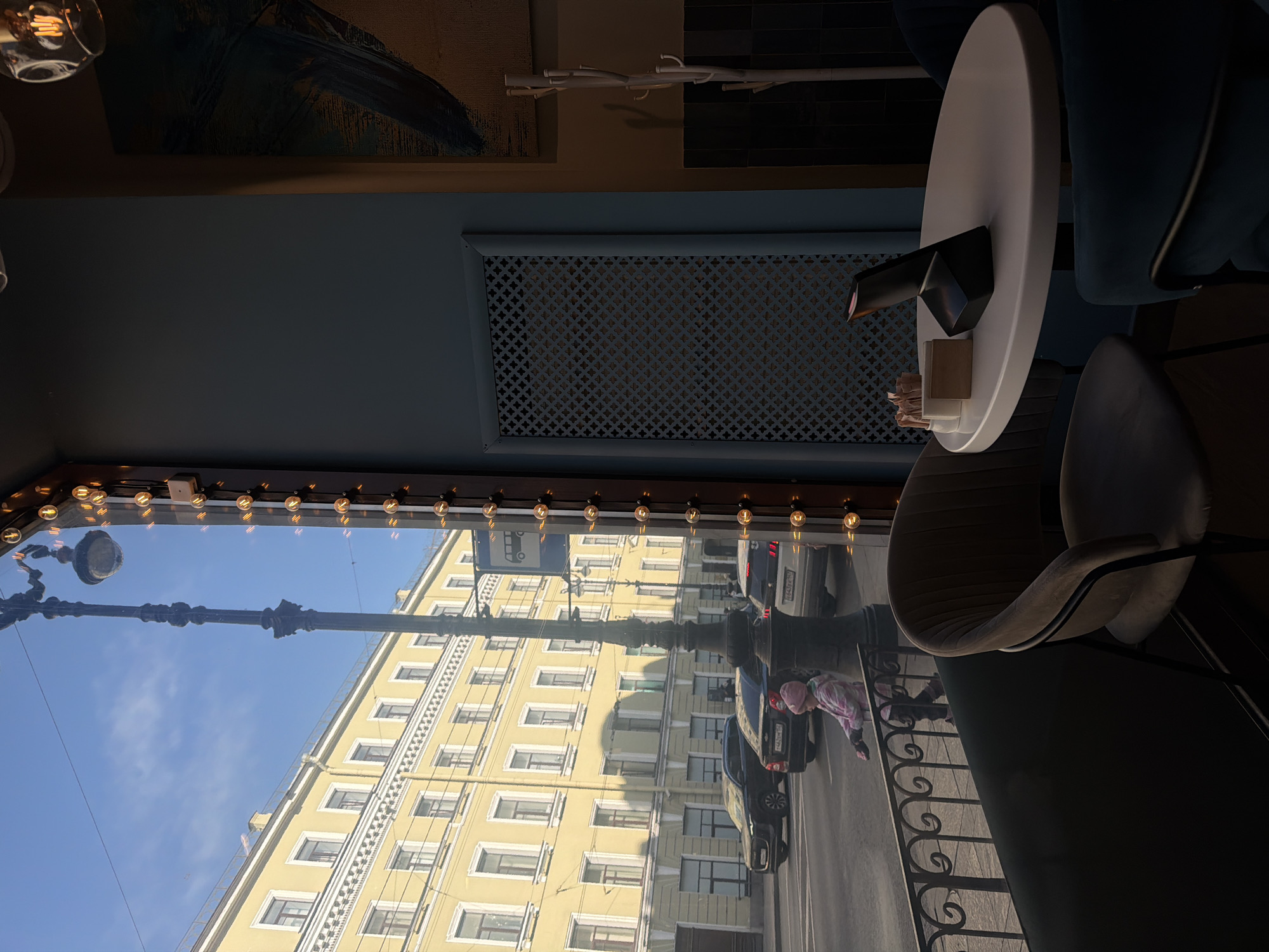 The image depicts a scene from inside a modern cafe looking out onto a sunlit street in Saint Petersburg, Russia