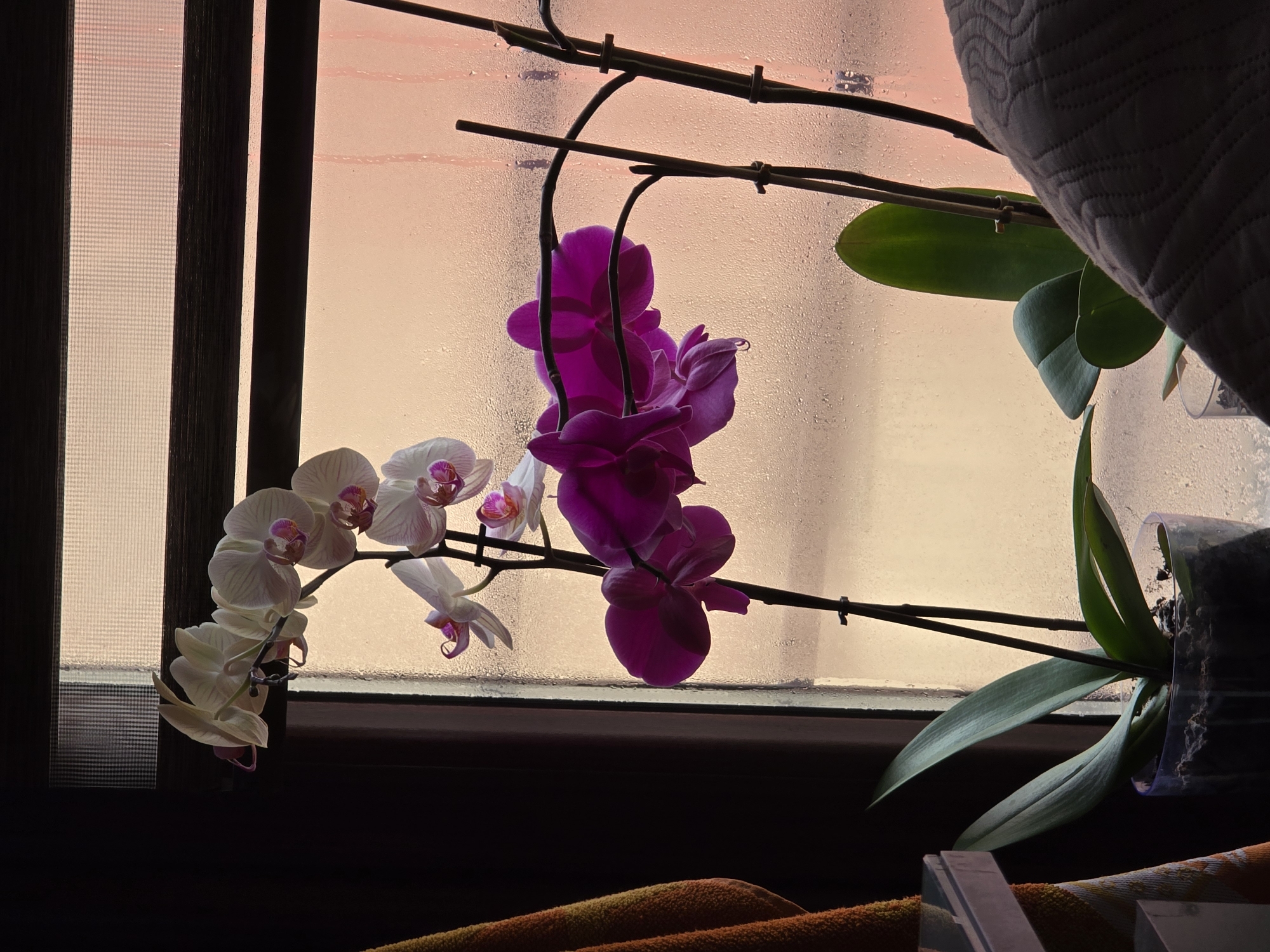 two orchids in front of a window. One orchid has white and pink flowers, and the other has deep purple flowers. The window appears to be partially obscured, possibly by condensation. The orchids are potted, and a gray towel-like object is partially visible on the right. The location is inside a building in Plovdiv, Bulgaria, near a window with visible light. Other details include a view through the window that appears to be a reddish hue and other items at the bottom of the frame that are out of focus.