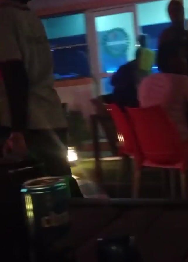 dimly lit outdoor bar or restaurant, possibly in the evening. The camera moves erratically, making it hard to focus. Several people are visible, though blurred and indistinct. One person is wearing a white shirt. Red chairs are also seen. There are tables with drinks including a green bottle, and a plastic cup. One shot shows a person's leg and a wristwatch with lights. Overhead string lights and the building's exterior are visible in the background. The overall impression is of a lively, social gathering, but the darkness and movement limit details.