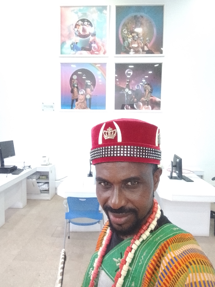 A man wearing a red velvet hat with a gold crown emblem, embellished with a beaded rim, stands indoors. He has a dark complexion, facial hair, and wears a white and red beaded necklace over a colorful woven garment. Behind him are four framed artworks on a white wall, each featuring surreal imagery. The setting appears to be an office space, with white desks, computers, and a blue chair visible.