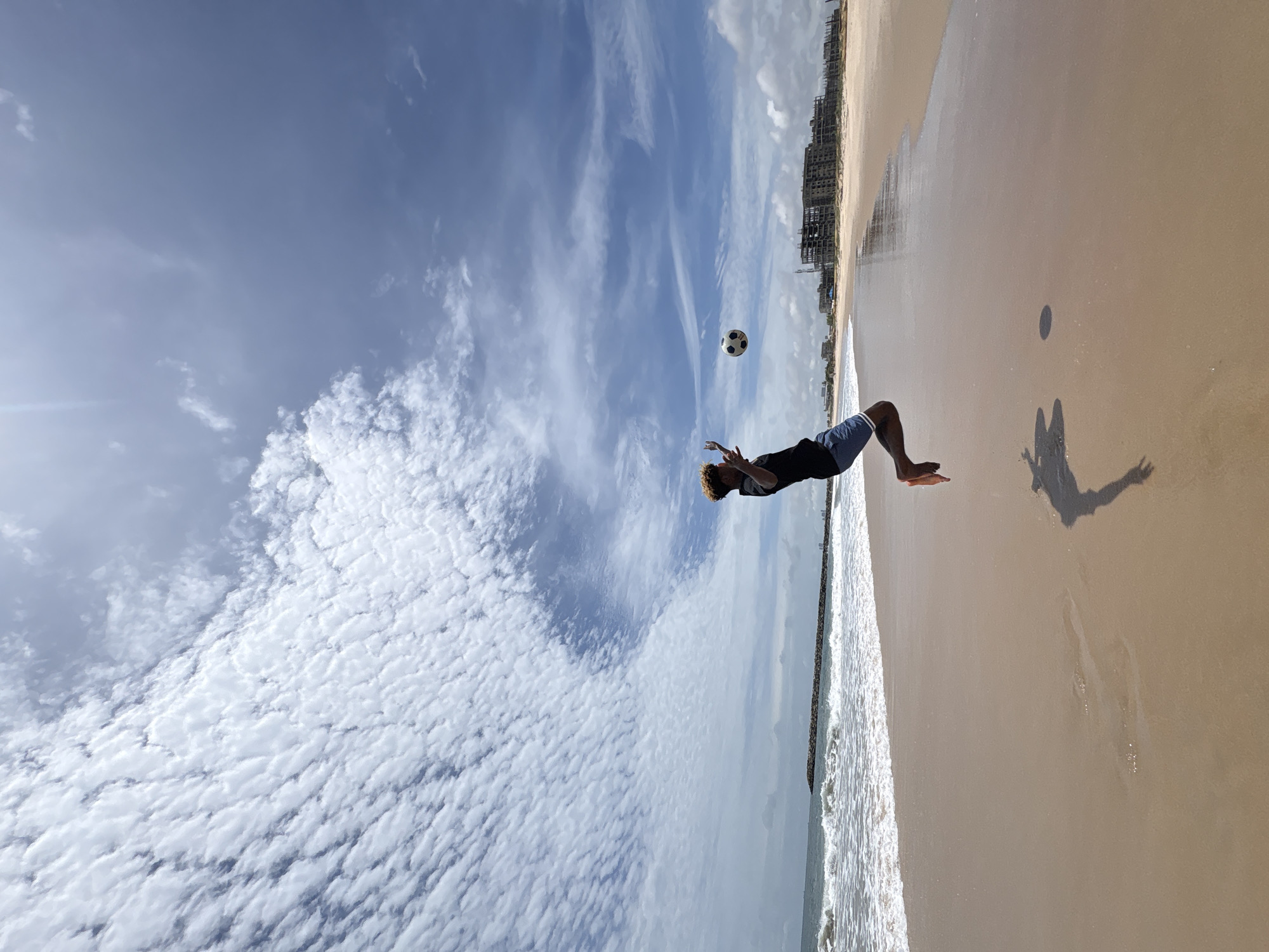 A man performs a backflip toward a soccer ball on a beach in Alaguntan, Nigeria. The sky is partly cloudy. Waves crash along the shoreline. A shadow of the man's silhouette is cast on the wet sand. Buildings stand in the distance along the horizon.