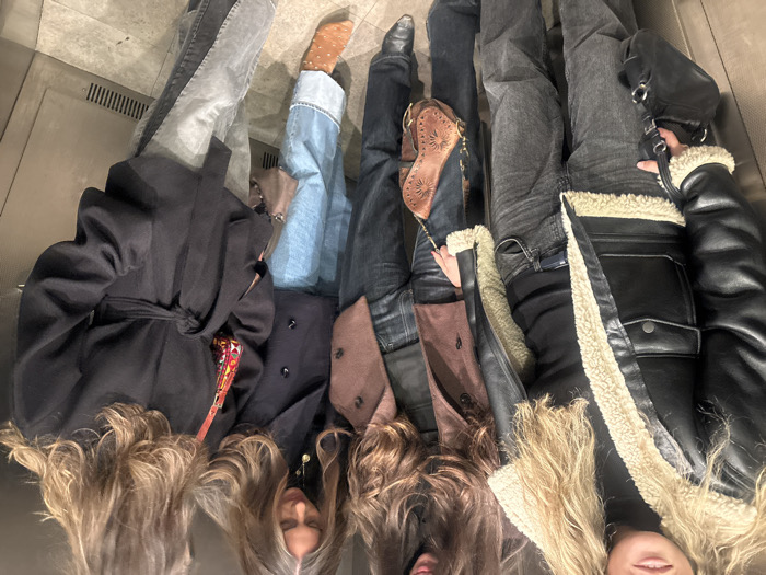 A group of four women are lying on their backs, presumably on the floor, creating a symmetrical arrangement. Their heads are facing downwards, while their feet point upwards. From left to right, they wear a black coat, dark blue coat, brown coat, and a black shearling jacket. Each person is wearing jeans, and they all have long blonde hair. A small, embellished purse is visible near the third woman.