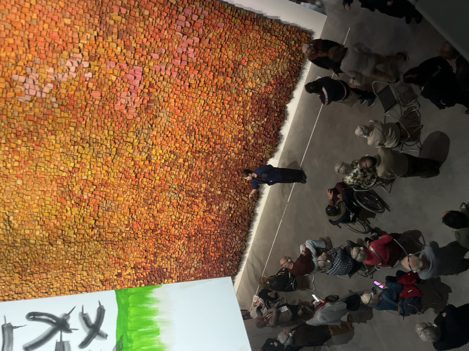 An overhead perspective captures an art tour in a gallery space at the Centre Pompidou (National Museum of Modern Art) in Paris, France. A female tour guide, dressed in a dark blue top and black trousers, stands before a large, wall-mounted artwork, gesturing with her right hand towards it. The artwork is a vast, textured mosaic composed of numerous small, irregularly affixed pieces of material in varying shades of orange, red, and yellow. To the left of this primary installation, a large white canvas hangs vertically, featuring several bold black brushstrokes resembling abstract birds or symbols above a horizontal strip of bright green paint. Approximately 20-25 individuals, primarily older adults, are gathered in a semi-circle, observing the artwork and listening to the guide. Many attendees are wearing over-ear headphones, indicating an audio tour. Some are seated on portable grey chairs, while others stand. One individual is seated in a wheelchair. The gallery floor is grey, marked with a single white line in front of the group and artwork. The walls are predominantly white.