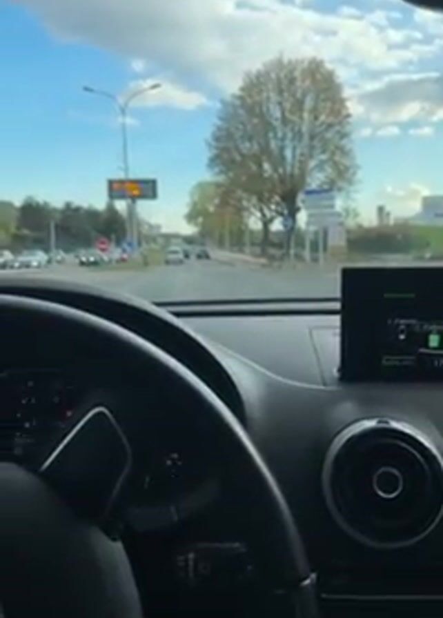 A car is stopped at an intersection, with a row of people crossing the street from left to right. They consist of people in t-shirts, hoodies, one wearing a baseball cap, and a red shirt. The interior of the car is visible, with the dashboard displaying information. A tree is visible in the background. The sky is partly cloudy.