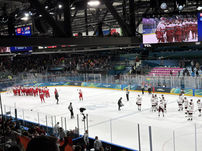 An indoor ice hockey game is in progress at an arena packed with spectators. Players in red and white uniforms are on one side of the rink, while the opposing team in burgundy and white lines up on the other. Referees are positioned between them. Above the rink, a large screen displays a close-up of the burgundy team. Scoreboards hang overhead, and Olympic rings adorn the side of the arena.