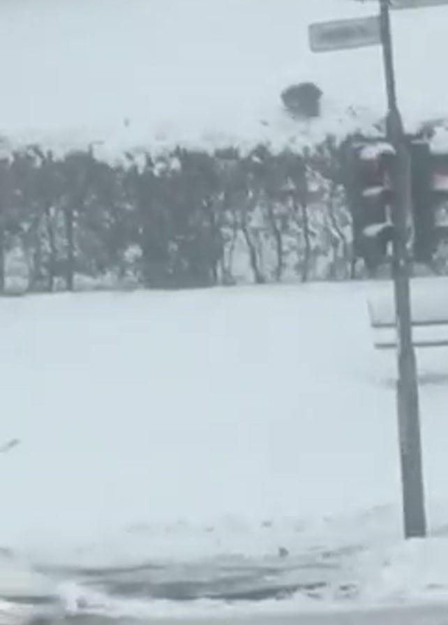 snow-covered street scene during heavy snowfall. In the background, there's a house and snow-covered vehicles. In the middle ground, there's a trimmed hedge covered in snow. A person is visible crouched behind the hedge. A street sign reading "Elberfelder Str." is also visible. A traffic light is present. The foreground shows a road covered with snow and tire tracks. The camera appears to be looking out from an elevated position, possibly a window.