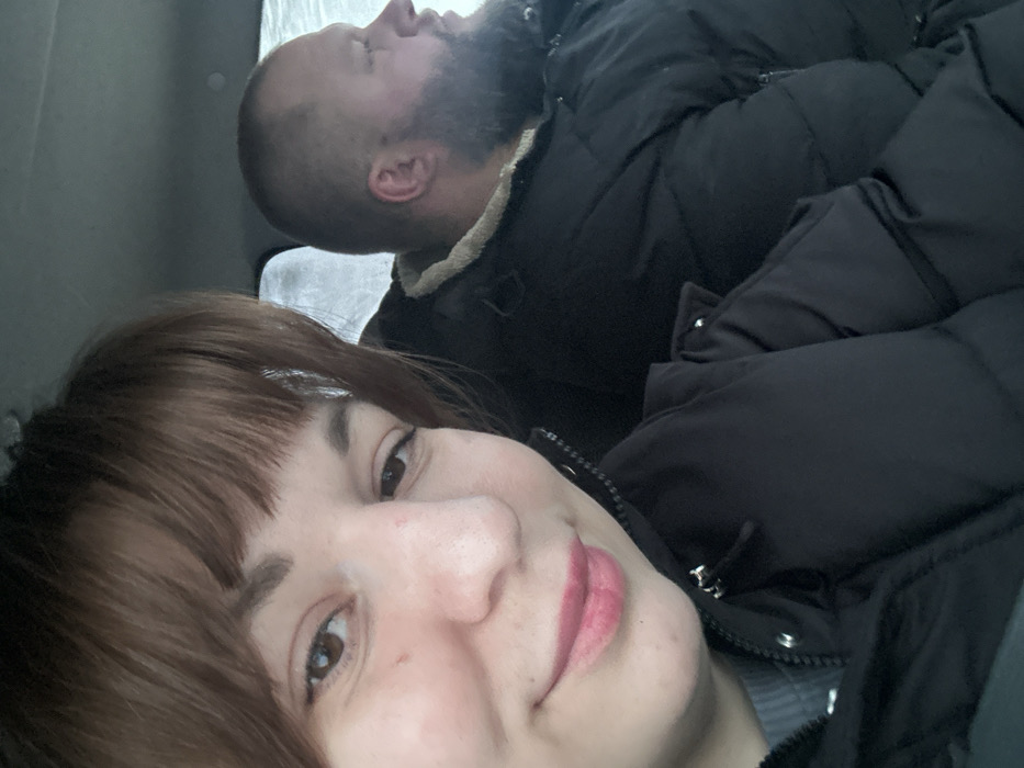 The scene is captured inside a vehicle, within what is contextually identified as Zhigalki, Russia. Two individuals are present. In the foreground, a female with shoulder-length brown hair and bangs is depicted from the chest up, positioned slightly to the left. She has light skin, brown eyes, and faint pink lipstick, and exhibits a slight smile while looking directly at the camera. She is wearing a black puffer jacket over a visible light grey knitted garment. Behind her and to the right, a male individual is visible in profile, facing right and looking forward. He has a full beard and short dark hair. He is also wearing a black puffer jacket, distinguished by a light-colored, possibly shearling or fleece, collar lining. The interior of the vehicle is dimly lit. The blurred exterior background visible through the vehicle's window suggests an overcast or snowy environment. No specific identifying objects or landmarks within Zhigalki, Russia, are discernible from the image itself.
