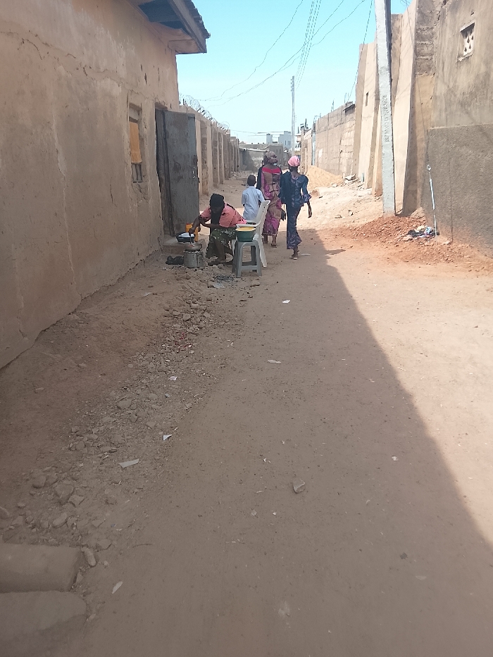 This image displays a narrow, unpaved dirt street in Giginyu, Nigeria, under clear, bright daylight