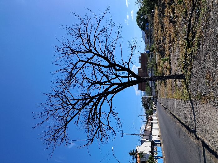 A leafless tree's silhouette stands against a bright blue sky. Its branches extend, creating a stark contrast. The tree is situated next to a narrow paved road with houses and utility poles along its side. A dry, grassy hillside rises in the background, adding depth to the scene. The image is oriented sideways.