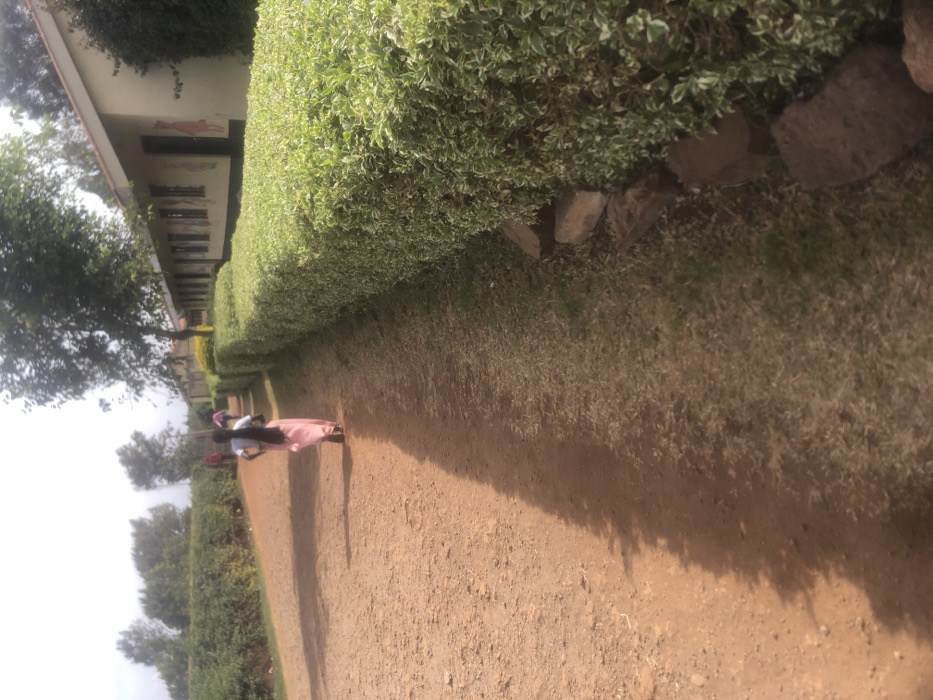 The image displays an outdoor scene in Ngong ward, Kenya, featuring a reddish-brown dirt path and a series of single-story buildings under natural daylight. A person, viewed from behind, walks along the dirt path away from the camera, wearing a light-colored top, a light pink skirt or dress, and has long dark hair extending down their back. To the right of the path, a low-cut hedge with variegated green and white foliage runs parallel to the path, separating it from the buildings. Several light-brown stones are positioned along the base of this hedge. Behind the hedge, a light-colored building, possibly part of a school, exhibits multiple dark window or door openings and faint colorful murals on its exterior walls. Further down the path, two additional blurred figures are visible in the distance; one appears to be wearing red, the other pink. The environment includes dense green trees and foliage in the background, flanking the path. A prominent shadow extends across the dirt path from the hedge and buildings. The sky is bright and appears overcast or hazy.