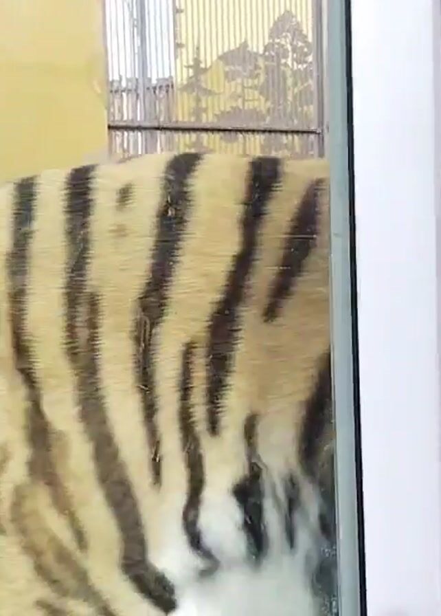close-up view of a tiger, presumably in captivity, viewed through a glass enclosure. The tiger's flank, displaying its characteristic black stripes on a tawny background, is the primary focus. Behind the tiger and visible through the enclosure, a metal fence is discernible. A small yellow object is visible partially obstructing the top left corner of the frame. The camera appears to be handheld and slightly shaky.