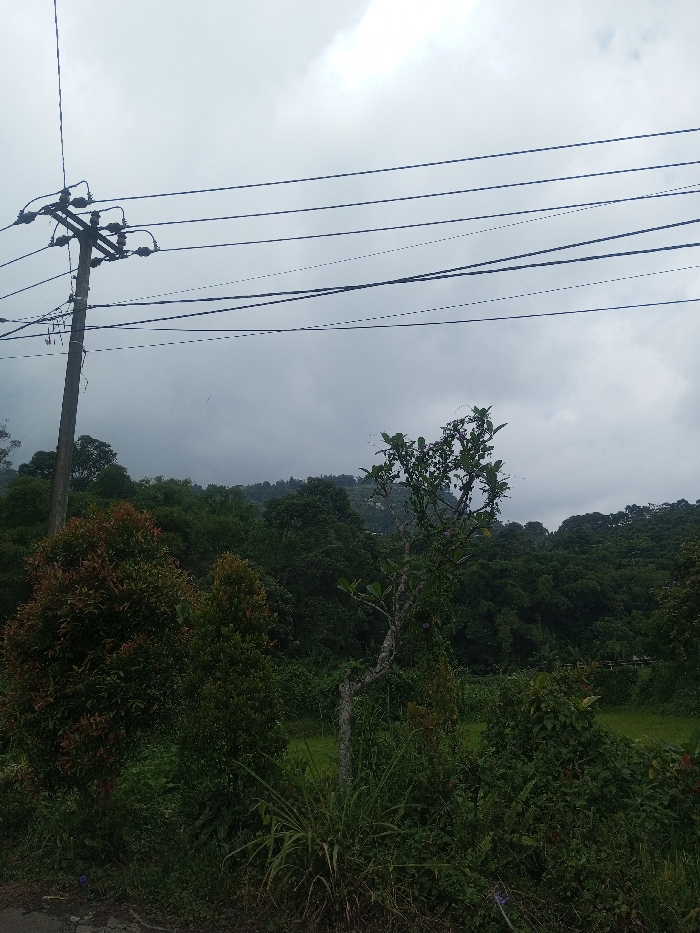 The image depicts an outdoor, natural landscape located in Cibodas, Indonesia, under an overcast sky. In the foreground, the edge of a dark, unpaved or asphalt surface is visible on the left. A dark wooden utility pole with multiple horizontal power lines occupies the left-center of the frame, extending towards the upper left. Below the power lines and extending across the mid-ground is dense, dark green foliage, including several trees and overgrown bushes. A prominent tree in the center-right features a gnarled, lighter-colored trunk and sparse green leaves, with hints of purple flowers or fruits. To its left, another tree exhibits reddish-brown new growth. Deeper within the mid-ground, a lighter green grassy field is partially visible, bordered by more dense vegetation. The background consists of forested hills or mountains, receding into the hazy, light grey sky. No individuals or specific actions are observed.