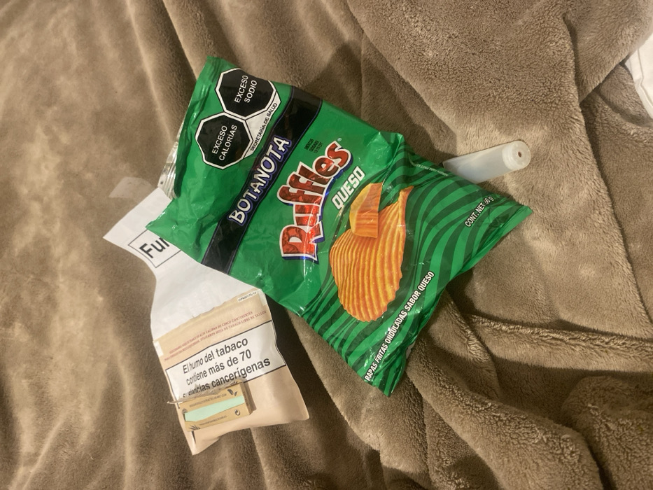 A green Ruffles "BOTANOTA" brand chip bag, opened at the top, rests on a light brown, textured fleece-like blanket